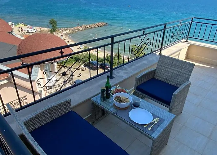 海辺のベッドルーム1室のIpanema Beach - New - Luxury First Line - Sea View スヴェティ・ヴラスアパートはBeach - Sveti Vlasから徒歩でわずか5分の場所にあります。 涼しいプールでくつろぐこともできます。